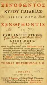 Xenophontos Kyrou paideias : biblia okto = Xenophontis de Cyri institutione libri octo. Grca recognovit, … emendavit, versionem Latinam reformavit, … notas H. Stephani, Leunclavii, … Porti & Mureti … adjunxit Thomas Hutchinson A.M